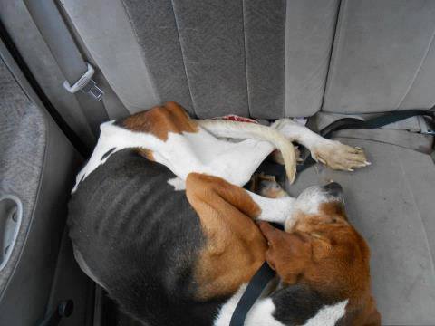 Rock was a Treeing Walker Coonhound, and we are all sure he was a hunting dog in the first couple years of his life. Either that or his genetics for coon hunting are really strong! When Glenna and Laura rescued him (May 2013), he had been left tied to his dog house and had nearly starved to death. (His owner had passed away.) They guessed he was about 3 years old at the time. He was emaciated, had a broken spirit, and his body needed a lot of care; it wasn’t clear whether or not he would recover. Then, Glenna and Laura worked their magic. They fed him, loved and encouraged him, gave him a super-comfy bed, provided vet care for him, and the real Rock re-emerged. He put on weight, gained back his muscle and strength, and started zooming and acting like a goofball. He was going to make it!